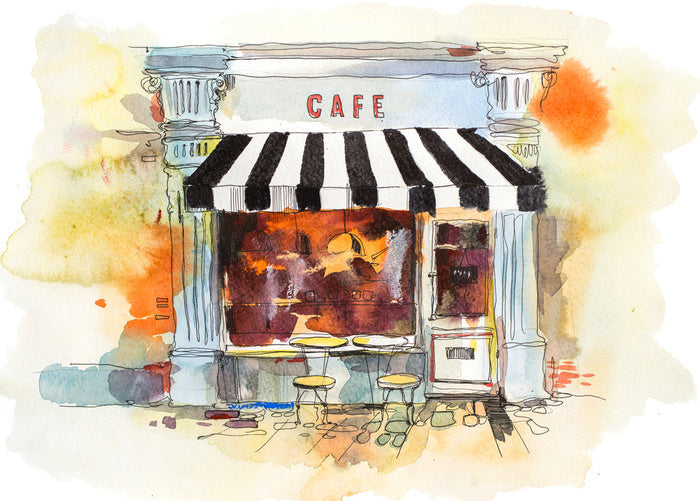 Under the striped awning